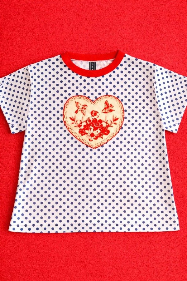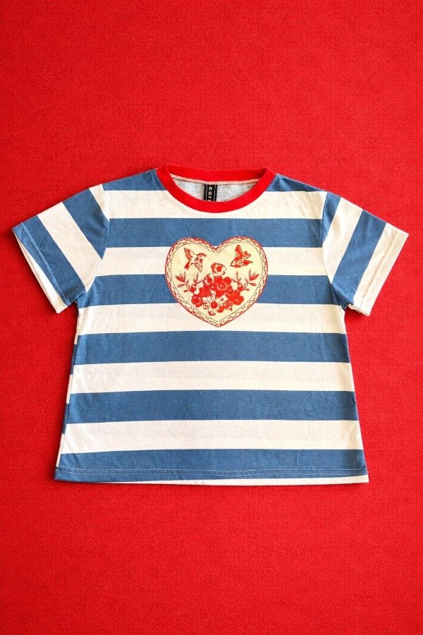 Estampa de corazon central con ilustracion de golondrinas y flores, representantes de la suerte, la libertad y la esperanza.