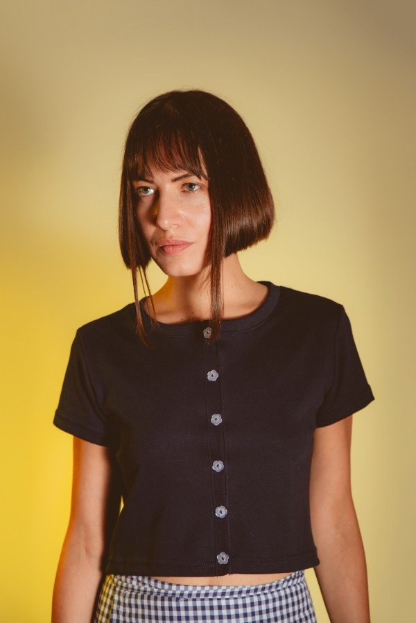 Remera crop de interlock demasiado suave para el tacto, tiene botones en forma de florcitas una delicadeza.