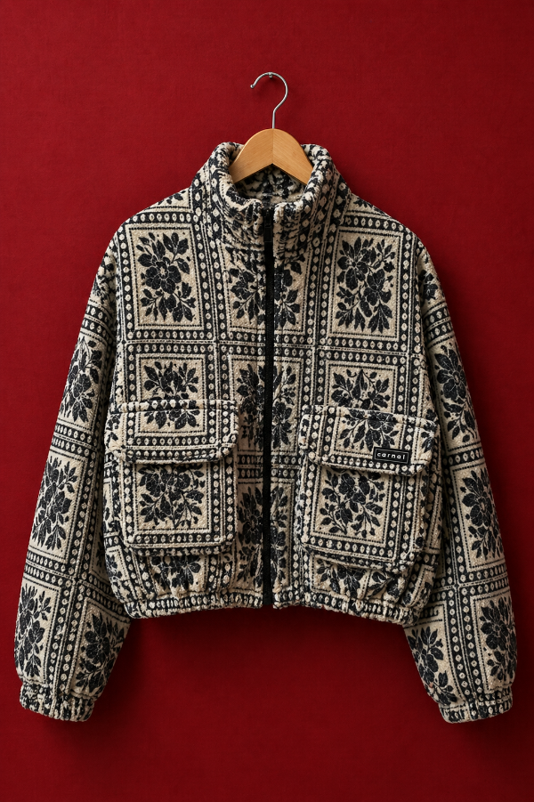 Campera oversise confeccionada en corderito bucle con bolsillos plaque y acceso con cierre, elástico en puños y cintura.
