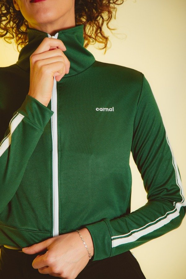 Campera crop, tela deportiva con bolsillos y cierre. Vivos laterales y bordado en tono blanco. Muy cancera y liviana para nochecitas de verano.