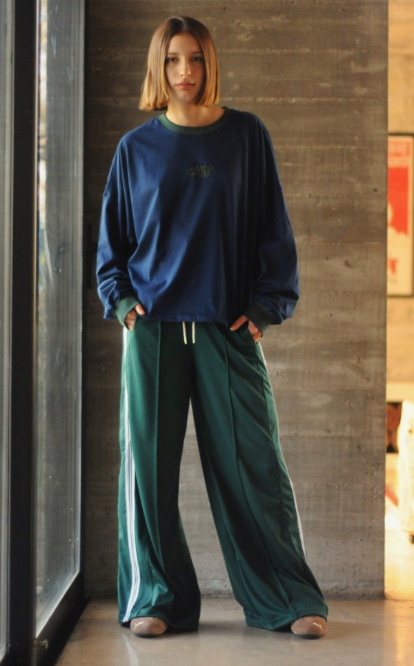 Pantalón palazo de tela deportiva premium. con vivos laterales tejidos, bolsillos y costuras reforzadas.
