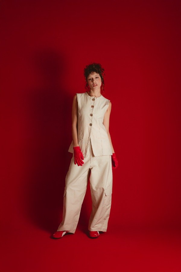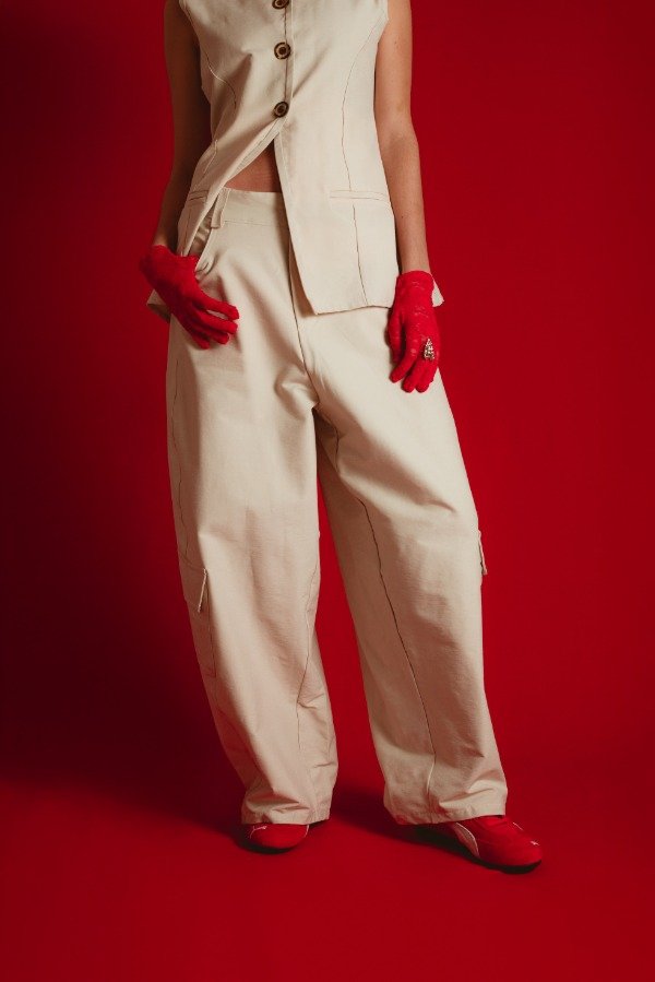 Es una silueta relajada, que te permite estar super comoda pero a la vez gracias a los recortes, detalles de confeccion y la tela con cuerpo le da mucha estructura y presencia convirtiendolo en un pantalon sumamente distinto y sofisticado. Podes usarlo con el chaleco en conjunto o con una prenda mas entallada destacando asi la morfologia del pant.