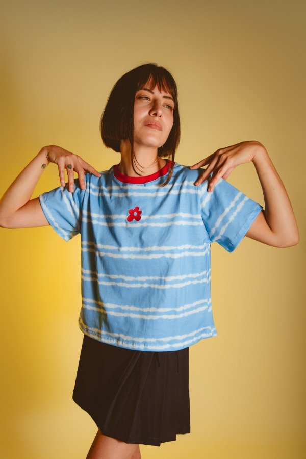 Remera corte regular de algodón peinado con rib rojo y detalle bordado en el centro. Un diseño único y alegre para empezar la mejor época del año con colores vibrantes.