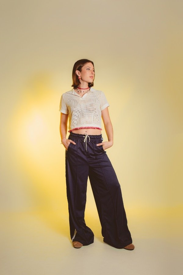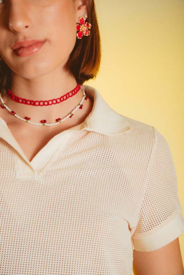 Remera de panal tejido con puños cuello y cintura tejida también tejida, la cintura tiene un detalle único con bolados cuadrille. Es una remera única para el calorcito que se asoma