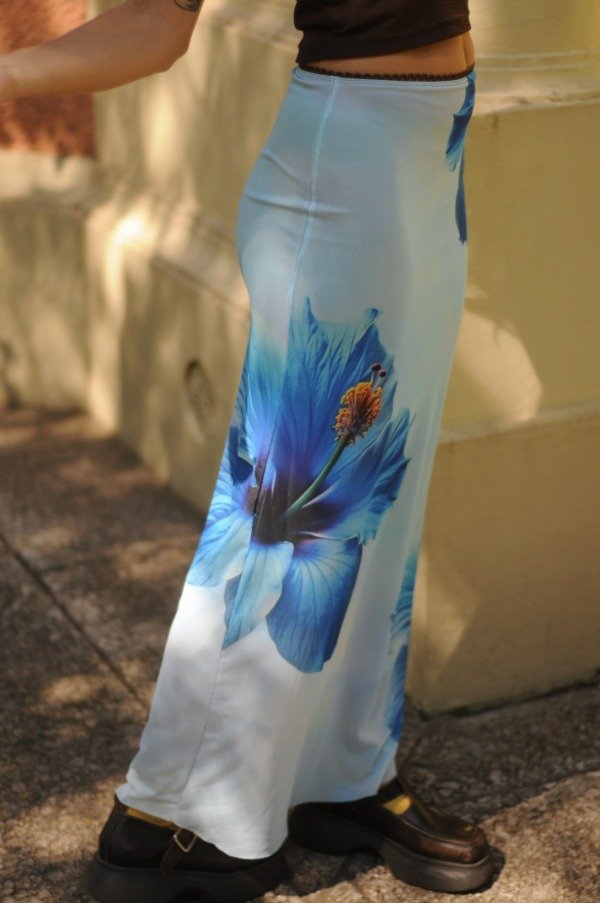 Falda larga de microtul elastizado estampado, forrada con microfibra elastizada y detalle de puntilla en cintura. Para ser una sirena tropical en la ciudad