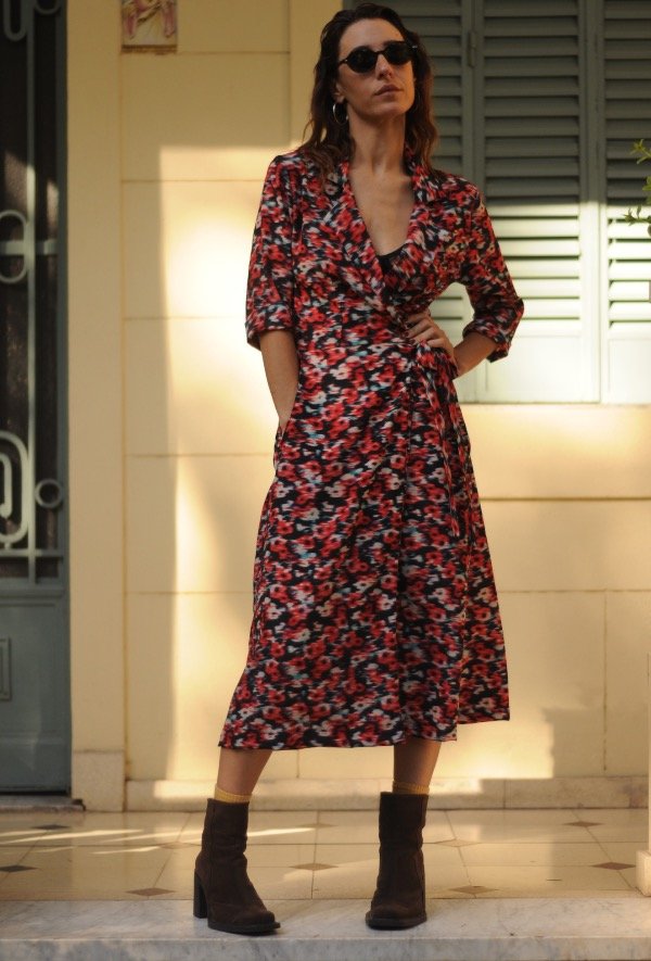 Vestido de seda estampada, con escote cruzado y lazo para anudar en lateral, manga 3/4.